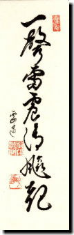 碧巌録49則の頌(樹)にある語。三聖慧然禅師と雪峰義存禅師の天地も揺るがすほどの大法戦。大禅匠があいゆずらぬ問答のなれど、スカッとしてすがすがしい。その一場に雪竇重顕禅師が韻分のコメントの一節がこの語である。大禅師方の禅境をのべあう問答は解説はしがたいが、この「一聲雷(いっせいらい)震(ふる)うて清風(せいひょう)起こる」語によって禅者の境涯がおぼろながら伺える気がする。
